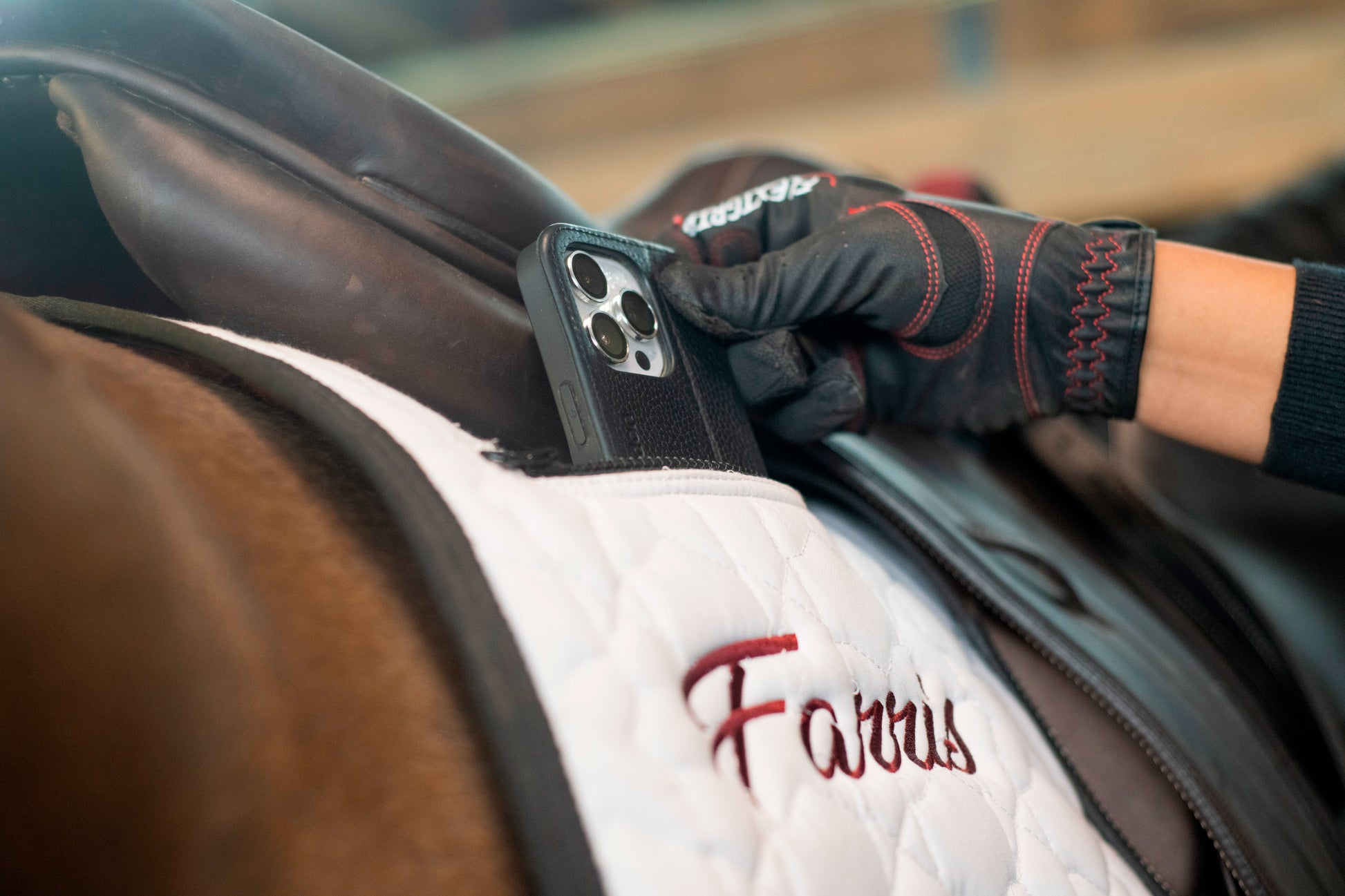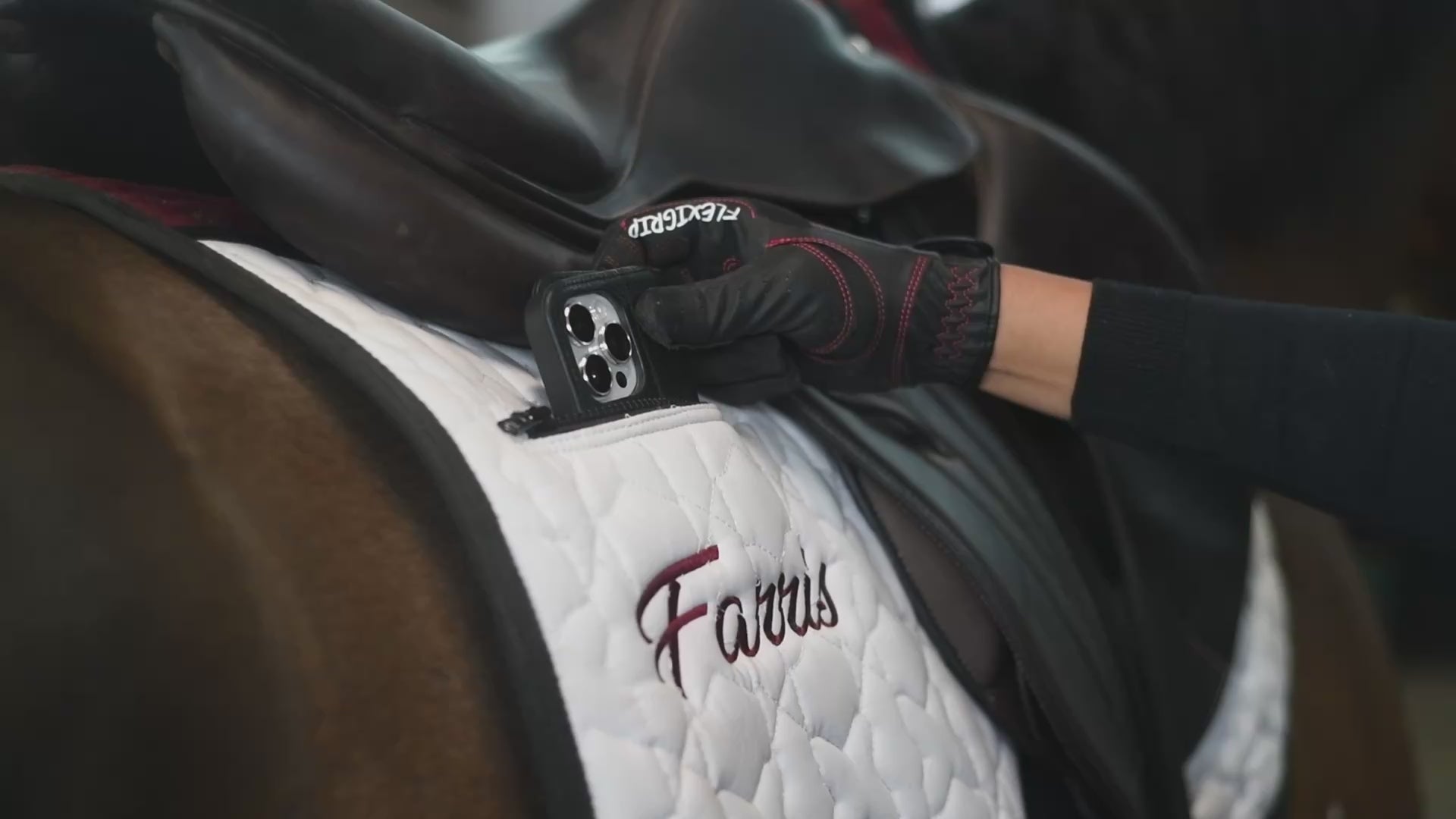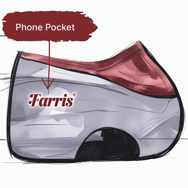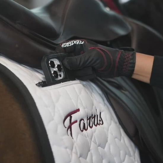 Revolutionary saddle pad with an anti-slip grip, phone pocket, and girth protection, designed for a secure and comfortable ride.